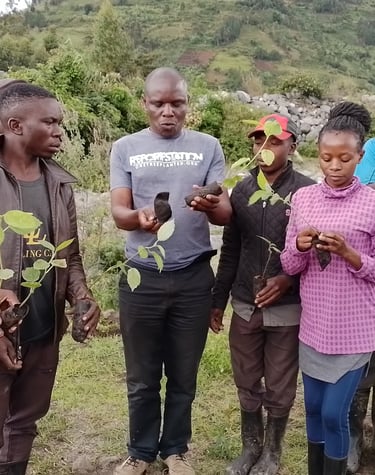 In addition to agricultural training, we work on community-led projects aimed at conserving natural resources, such as reforestation, clean water and menstrual hygiene management. Through these initiatives, we empower communities to adapt to the impacts of climate change, promoting environmental stewardship and resilience. Our educational campaigns focus on raising awareness about the importance of conserving ecosystems and using resources sustainably, ensuring that future generations can enjoy the rich natural heritage of the Rwenzori region.